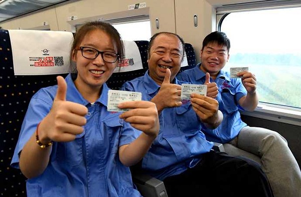 9月10日,參與鄭徐高鐵建設的中鐵電氣化局三公司的工作人員乘坐鄭徐高鐵首趟動車組列車。新華社記者 李安 攝