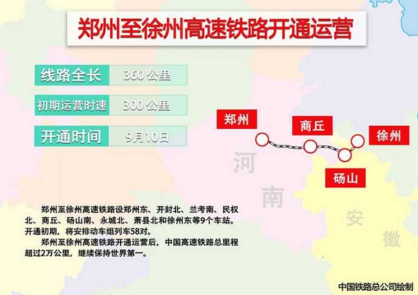 隨著10日6點31分G1908次高鐵列車從鄭州東站發(fā)出,鄭(州)徐(州)高鐵正式開通運營,標志著中國高鐵運營里程突破2萬公里。
