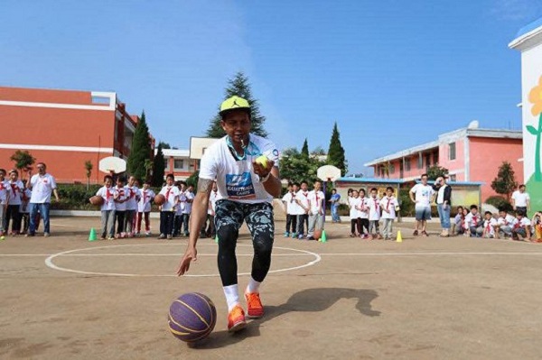 更令他們興奮的是法籍籃球教練Stevens Servina與他們的籃球互動(dòng)課。Stevens曾任耐克籃球訓(xùn)練營(yíng)主教練,在農(nóng)村教孩子們?nèi)绾螣嵘?、運(yùn)球、折返跑。