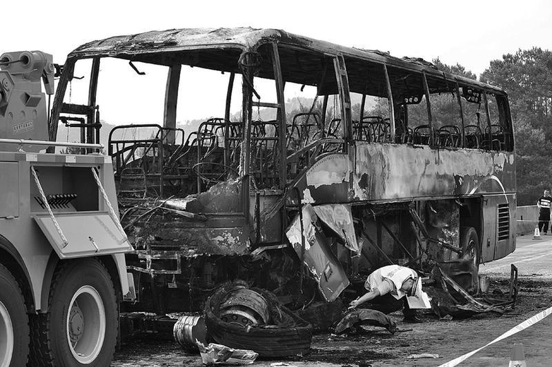 現(xiàn)場(chǎng)目擊者傳給記者的多段視頻顯示,一輛暗紅色大巴車起火燃燒,先是車窗中冒出濃重的黑煙,隨后整輛車燃燒起來,黑煙滾滾;視頻中多人受傷流血,有人被抬上救護(hù)車,能聽到警車的警笛聲。