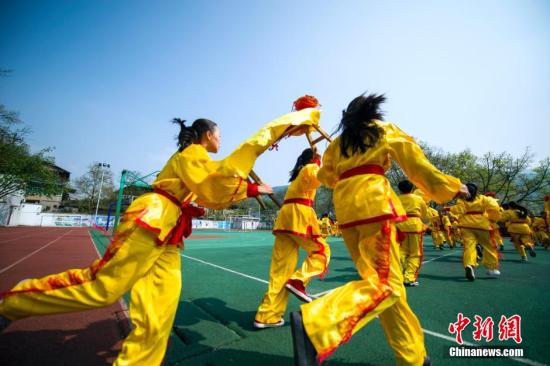 資料圖:重慶市澄江小學(xué)的百余名學(xué)生,在操場上拿著一米長的小板凳舞起“板凳龍”,共迎春暖。陳遠(yuǎn)鴻 攝