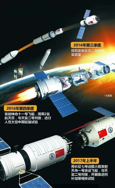 這位發(fā)言人說(shuō),按計(jì)劃將于2016年第三季度,擇機(jī)發(fā)射天宮二號(hào)空間實(shí)驗(yàn)室;2016年第四季度,發(fā)射神舟十一號(hào)飛船,搭乘2名航天員,與天宮二號(hào)對(duì)接,進(jìn)行人在太空中期駐留試驗(yàn);在此之前,還將在文昌發(fā)射場(chǎng)進(jìn)行長(zhǎng)征七號(hào)運(yùn)載火箭首飛試驗(yàn),通過(guò)考核后將于2017年上半年,用長(zhǎng)征七號(hào)運(yùn)載火箭發(fā)射天舟一號(hào)貨運(yùn)飛船,與天宮二號(hào)對(duì)接,開展推進(jìn)劑補(bǔ)加等相關(guān)試驗(yàn)。
