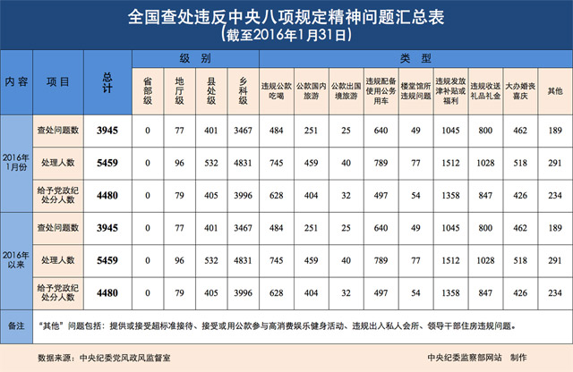 中央紀(jì)委監(jiān)察部網(wǎng)站今日發(fā)布1月份全國(guó)查處違反中央八項(xiàng)規(guī)定精神問(wèn)題情況。截至1月31日,全國(guó)查處違反中央八項(xiàng)規(guī)定精神問(wèn)題3945起,處理5459人,給予黨政紀(jì)處分4480人。