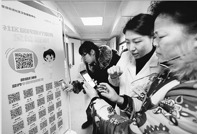 1月27日起,在安徽省合肥市蜀山區(qū)五里墩街道社區(qū)衛(wèi)生服務(wù)中心,居民只要關(guān)注該中心微信公號(hào)“小薇社區(qū)”,就可以通過(guò)手機(jī)進(jìn)行家庭醫(yī)院簽約、咨詢(xún)、預(yù)約診療等,“指尖醫(yī)生”下班不下線(xiàn)。圖為工作人員向前來(lái)就診咨詢(xún)的居民介紹使用方法。