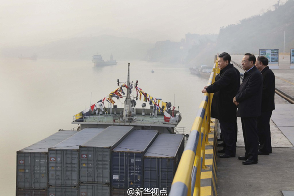 新華網(wǎng)北京1月5日電習(xí)近平總書記4日下午來到重慶果園港考察,聽取長江上游航運(yùn)中心建設(shè)、鐵路公路水路聯(lián)運(yùn)等情況介紹,察看正在作業(yè)的集裝箱船。聽說渝新歐國際鐵路沿線國家實(shí)現(xiàn)一次報(bào)關(guān)查驗(yàn)、全線放行,他贊賞“挺好”??吹礁劭谠O(shè)施齊備,已初具規(guī)模,他說:“這里大有希望?!?/p>