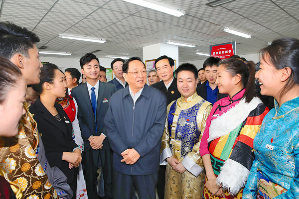 俞正聲十分關(guān)心西藏大學(xué)的發(fā)展。2013年8月,在西藏考察工作期間,俞正聲曾專程到西藏大學(xué)視察,并對(duì)學(xué)校發(fā)展提出殷切希望。在西藏大學(xué)新校區(qū)圖書館,俞正聲認(rèn)真了解學(xué)校校史、學(xué)科設(shè)置、特色專業(yè)等情況,觀看了藏漢交互式多媒體教學(xué)系統(tǒng)、崗杰漢藏機(jī)器翻譯系統(tǒng)演示。俞正聲充分肯定西藏大學(xué)堅(jiān)持辦學(xué)特色、優(yōu)化專業(yè)結(jié)構(gòu)、積極服務(wù)社會(huì)的做法。在圖書閱覽室,同學(xué)們興奮地簇?fù)碓谟嵴暽磉?。俞正聲與同學(xué)們親切交談,關(guān)切地詢問大家的學(xué)習(xí)生活情況和畢業(yè)后的打算。聽說達(dá)瓦維色同學(xué)畢業(yè)后要自己創(chuàng)業(yè),俞正聲稱贊他有理想、了不起。他勉勵(lì)同學(xué)們要努力提高自身就業(yè)能力,切實(shí)轉(zhuǎn)變就業(yè)觀念,立足實(shí)際,扎根邊疆,敢于創(chuàng)新,勇于創(chuàng)業(yè),做中國(guó)特色社會(huì)主義事業(yè)的合格接班人。