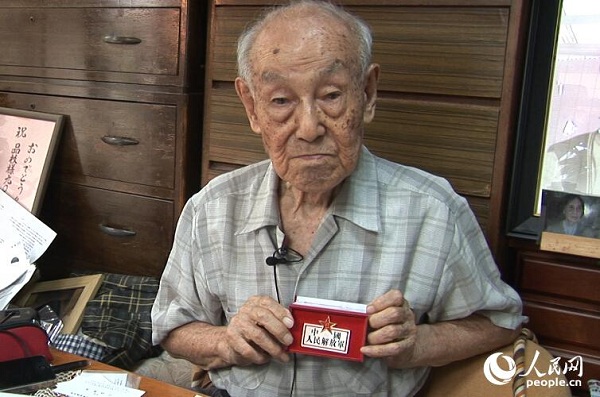 小林寬澄向人民網(wǎng)記者展示中國人民解放軍紀念勛章(趙松攝)