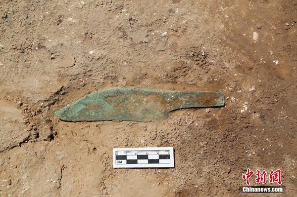 遺址內(nèi)的土銅刀。中新社發(fā) 王永強 攝