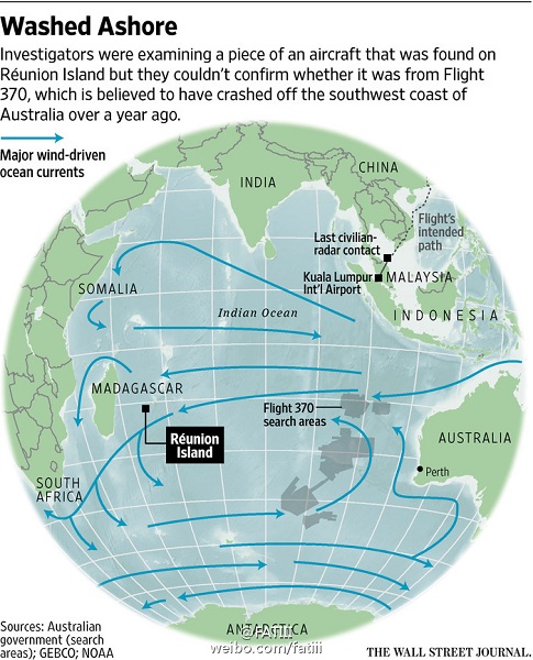 另據(jù)外媒報道,疑似MH370殘骸發(fā)現(xiàn)的地方在目前搜尋區(qū)域的西北方向,靠近非洲馬達(dá)加斯加。海洋學(xué)家分析符合洋流運(yùn)動規(guī)律。
