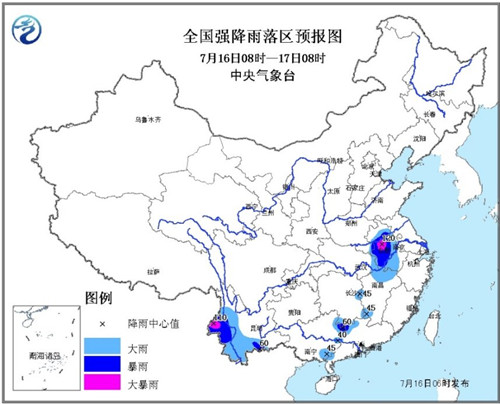 其中,安徽中部及云南西北部等地的局部地區(qū)有大暴雨(100~120毫米);上述局地并有短時(shí)雷暴大風(fēng)等強(qiáng)對(duì)流天氣。