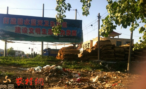 在華陰市華西鎮(zhèn)一塊“打造碧水藍(lán)天衛(wèi)生城鎮(zhèn) 建設(shè)文明生態(tài)魅力華西”的廣告牌前,垃圾堆很是顯眼。