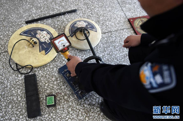 4月10日,民警向記者展示盜墓者使用的金屬探測儀。