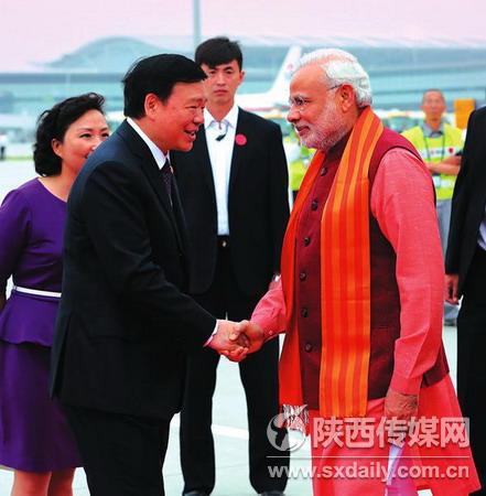 省長(zhǎng)婁勤儉對(duì)剛下飛機(jī)的印度總理莫迪說(shuō),尊敬的莫迪總理,我代表習(xí)近平主席家鄉(xiāng)陜西省的人民歡迎您。