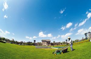 昨日西安天氣晴好,藍天白云下,南門廣場上一名工人正在推著割草機修剪草坪。