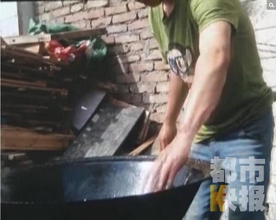 “這油是啥油?”“你放心油是菜油。”“為何是黑色的?”“那要炸茄子,炸魚什么的?!闭ㄍ昵炎诱~,炸完魚再炒菜,除了這黑乎乎的油是多次重復(fù)利用之外,記者看到這個加工點是典型的小作坊,只見,房間的后半部分是用來住人的,前半部分是用來切菜蒸米飯的,門口是用來炒菜的。根本不具備加工食品的條件?!霸圻@沒有健康證吧?”“沒有,沒有辦?!?