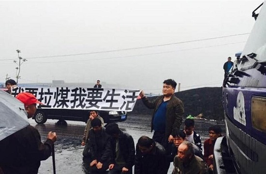4月18日下午,陜西韓城,多名拉煤司機(jī)被困在韓城市桑樹(shù)坪鎮(zhèn)雷嶺村,當(dāng)?shù)卮迕褡钄r了他們的去路。在雨中,拉煤司機(jī)拉出橫幅并下跪求村民放行。據(jù)了解,當(dāng)?shù)赜幸粋€(gè)礦井,最近一個(gè)公司的車隊(duì)通過(guò)招標(biāo)后和礦井簽訂了協(xié)議,負(fù)責(zé)運(yùn)輸煤礦??墒钱?dāng)?shù)氐拇迕裾J(rèn)為,車隊(duì)較低的價(jià)格影響他們?nèi)サV井拉活兒,所以就讓一些老人和婦女堵著路,不讓車隊(duì)經(jīng)過(guò)拉煤。目前,經(jīng)過(guò)民警做工作,村民已經(jīng)離去,拉煤車輛均已逐一通過(guò)。圖為司機(jī)下跪現(xiàn)場(chǎng)。