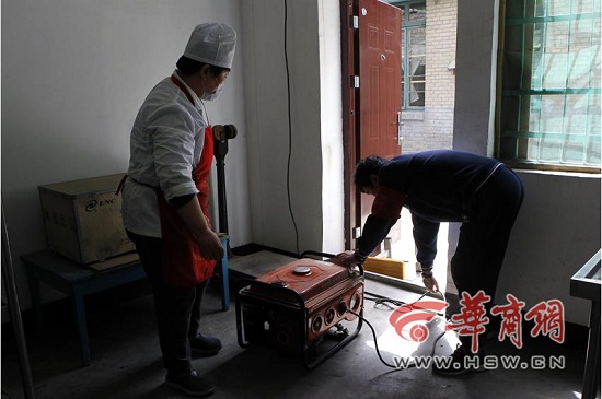 為保證孩子正常飲食,園方搬出許久不用的自備發(fā)電機(jī)為食堂供電。