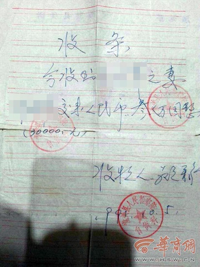 從師女士提供的給檢察院交錢的3張手寫的收據(jù)上看,收據(jù)上均寫著“今收到王某某之妻師某某交來的人民幣******元”字樣,落款有收款人簽名,收款人共涉及4人,其中兩張收據(jù)上蓋有“潼關(guān)縣人民檢察院自偵科”的公章,一張上有交款人和經(jīng)手人的簽名和手印。3張收據(jù)中,1張收據(jù)顯示收3萬元,其余兩張各顯示收1萬元,收款時(shí)間分別為:1991年9月16日,1991年9月18日,1991年10月5日。