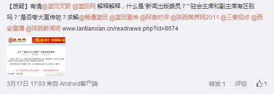 據(jù)新浪微博爆料:【質(zhì)疑】有請藍田文聯(lián)、藍田網(wǎng)解釋解釋,什么是“新聞出版委員?”“駐會主席和副主席有區(qū)別嗎?”是否夸大宣傳呢?求解 http://www.lantianxian.cn/readnews.php?id=8674