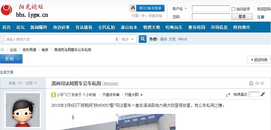 2015年3月6日下班期間“陜KD057警”司法警車一直在清澗縣電力局大院里停放著,有公車私用之嫌。