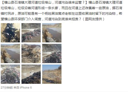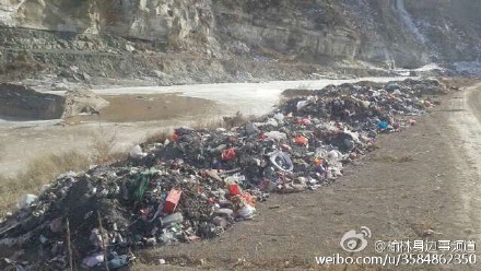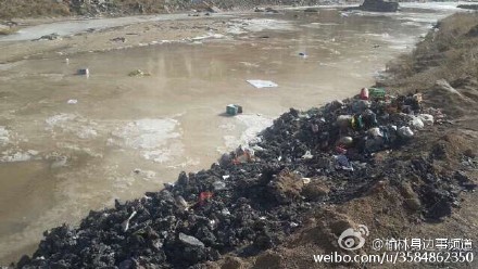 據(jù)新浪微博爆料:橫山縣石灣鎮(zhèn)大理河道垃圾堆山,垃圾沿著河道形成一條長廊,而且在河道上還存集著一些原油,據(jù)石灣鎮(zhèn)村民講,原油可能是有一個楊姓黑油窩點老板在這里收黑油時留下的污染物,希望橫山縣環(huán)保部門介入調(diào)查,河道污染到底誰來擔(dān)責(zé)?