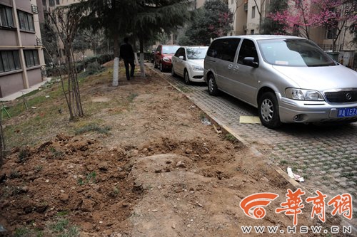 王先生是祥和居小區(qū)的住戶。昨日上午,他給華商報打來電話,說小區(qū)物業(yè)正在鏟小區(qū)里的綠化帶,要改建成停車場,頭兩天就鏟了一部分了,他擋過,現(xiàn)在又開始鏟了。華商報記者趕到現(xiàn)場,看到了被鏟的綠化帶。這是位于小區(qū)3號樓和5號樓之間的綠化區(qū)域。