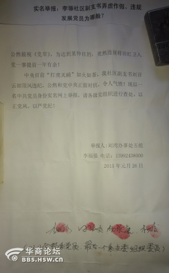 我叫李福強(qiáng),家住劉灣辦事處李塬社區(qū)五組,中共黨員,現(xiàn)實(shí)名舉報(bào)我社區(qū)副支部書記劉召云(原主持工作)弄虛作假、違規(guī)發(fā)展黨員一事,請各級黨組織及新聞媒體和廣大群眾對此做出處理及評議!