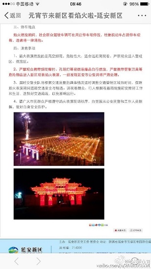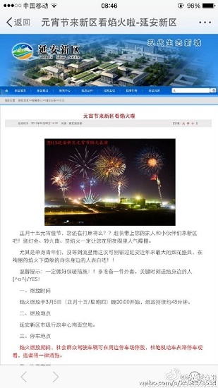 據(jù)新浪微博爆料:正月十五,延安新區(qū)在剛建好的廣場組織放焰火。從晚上10點開始,持續(xù)了48分鐘,因觀看群眾多導(dǎo)致大堵車。網(wǎng)友質(zhì)疑,2013年中央紀委下發(fā)《關(guān)于嚴禁元旦春節(jié)期間公款購買贈送煙花爆竹等年貨節(jié)禮的通知》。請延安新區(qū)說明此次花費多少?是否公費?