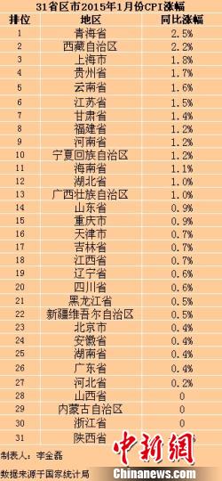 在這31個省份中,青海1月份CPI同比漲幅最高,為2.5%,西藏次之,漲幅為2.2%,這兩地也是全國僅有的CPI漲幅在“2”時代的地區(qū)。