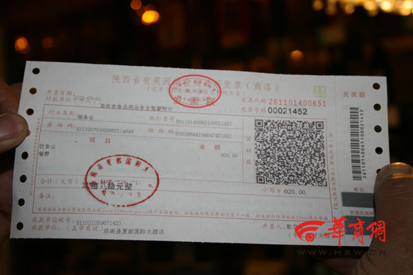 根據(jù)酒店提供的發(fā)票,華商報記者看到,發(fā)票抬頭為“商洛市食品藥品安全監(jiān)督所”,總共消費金額為920元。