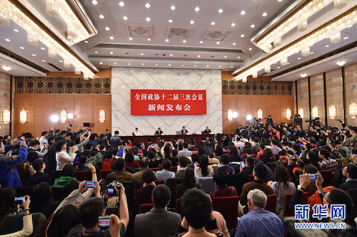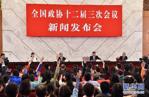 3月2日,全國(guó)政協(xié)十二屆三次會(huì)議新聞發(fā)布會(huì)在北京人民大會(huì)堂舉行,大會(huì)發(fā)言人呂新華介紹會(huì)議有關(guān)情況并回答中外記者提問(wèn)。 新華社記者 李鑫攝