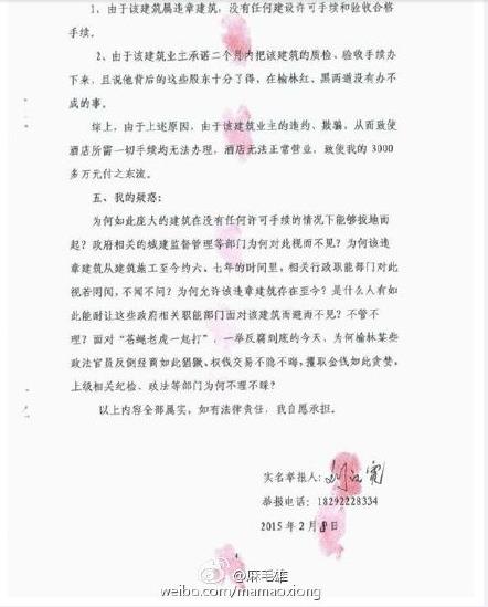 據(jù)新浪微博爆料:佳縣劉漢寬實(shí)名舉報(bào)榆陽區(qū)法院副院長(zhǎng)王文平等多名榆林官員股東,將未經(jīng)驗(yàn)收合格的希爾斯國(guó)際大酒店違章建筑出租給經(jīng)營(yíng)商,騙取200多萬承包費(fèi)及1800多萬裝修費(fèi),導(dǎo)致經(jīng)營(yíng)商損失高達(dá)3000多萬。