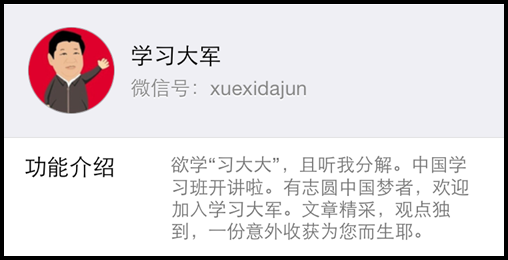 《學(xué)習(xí)大國(guó)》專注對(duì)一手重大資料以全新視角作精彩報(bào)道。其名稱源自習(xí)近平總書(shū)記發(fā)出的號(hào)召,“中國(guó)要永遠(yuǎn)做一個(gè)學(xué)習(xí)大國(guó)”。這一公號(hào)于2014年11月14日上線,一出手就非同凡響,連發(fā)《習(xí)奧瀛臺(tái)夜話全紀(jì)錄》《12日習(xí)奧會(huì)細(xì)節(jié)獨(dú)家揭秘》兩篇文章,影響甚巨。11月15日至11月19日,刊發(fā)《跟習(xí)大大出訪》的5篇系列文章。其中,《彭麗媛:第一夫人加分“軟實(shí)力”》一度成為全國(guó)媒體和公眾關(guān)注的焦點(diǎn)新聞。迄今刊發(fā)《縣委書(shū)記要做“四有新人”》《這次政治局會(huì)議,又有哪些不可錯(cuò)過(guò)的信號(hào)》等50多篇搶眼走心、膾炙人口的佳作,呈現(xiàn)出黨和國(guó)家最高領(lǐng)導(dǎo)人治國(guó)理政運(yùn)籌帷幄、赤心為民的鮮明人格魅力,深度契合公眾期盼。
