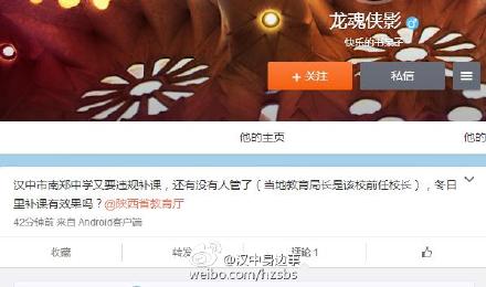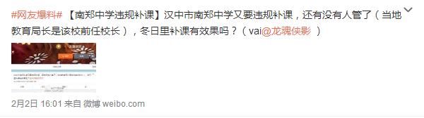 據(jù)新浪微博爆料:漢中市南鄭中學(xué)又要違規(guī)補(bǔ)課,還有沒(méi)有人管了(當(dāng)?shù)亟逃珠L(zhǎng)是該校前任校長(zhǎng)),冬日里補(bǔ)課有效果嗎?
