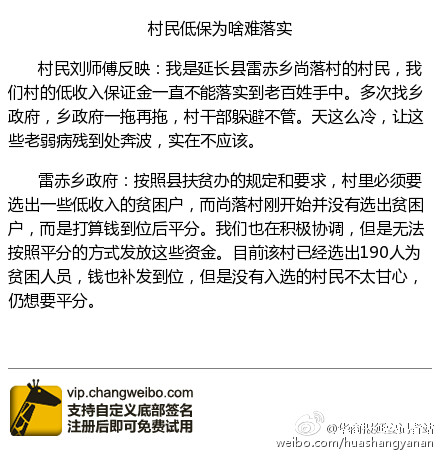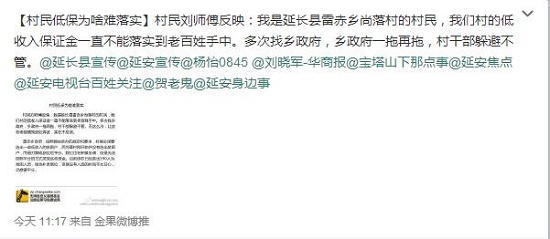 據(jù)新浪微博爆料:村民劉師傅反映,我是延長縣雷赤鄉(xiāng)尚落村的村民,我們村的低收入保證金一直不能落實到老百姓手中。多次找鄉(xiāng)政府,鄉(xiāng)政府一拖再拖,村干部躲避不管。