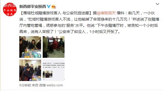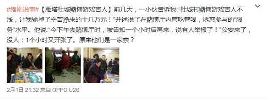 據(jù)新浪微博爆料:前幾天,一小伙告訴我:“杜城村賭博游戲害人不淺,讓我輸?shù)袅诵量鄴陙?lái)的十幾萬(wàn)元!”并述說(shuō)了在賭博廳內(nèi)管吃管喝,誘惑參與的“服務(wù)”水平。他說(shuō):“今下午去賭博廳時(shí),被告知一個(gè)小時(shí)后再來(lái),說(shuō)有人舉報(bào)了!”公安來(lái)了,沒人;1個(gè)小時(shí)又開張了。原來(lái)他們是一家親?