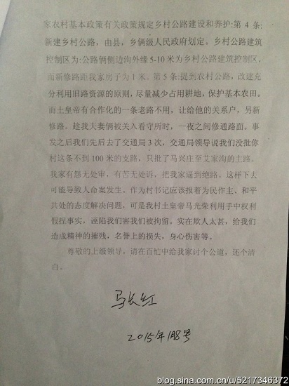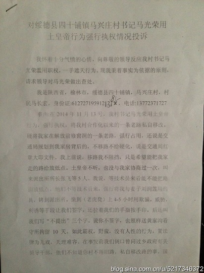 2014年11月13日,綏德縣四十里鋪鎮(zhèn)馬興莊村硬化一條村路,由于該硬化道路占用了村民馬長(zhǎng)紅家的老路,且路面高出馬長(zhǎng)紅家院子很多,嚴(yán)重影響了馬長(zhǎng)紅家院子出水問題。為此,馬長(zhǎng)紅家人要求工隊(duì)暫時(shí)停工,等技術(shù)員來了協(xié)商一下,看能不能將路面降低一點(diǎn),盡量不要影響自家院子出水問題。然而,村支書馬光榮卻叫來該鎮(zhèn)派出所所長(zhǎng)張飛,張所長(zhǎng)帶領(lǐng)4名民警將村民馬長(zhǎng)紅及妻子銬回派出所,坐上老虎凳,采用威逼利誘等手段讓村民馬長(zhǎng)紅在老虎凳上簽了字,強(qiáng)拉馬長(zhǎng)紅的手按了手印,最后又將夫妻二人行政拘留10天,關(guān)押在綏德縣看守所。但直至現(xiàn)在夫妻兩也沒有見到派出所的任何拘留通知書或決定書!