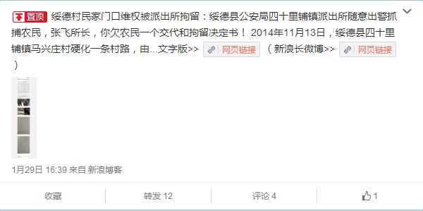 據(jù)新浪微博爆料:綏德縣公安局四十里鋪鎮(zhèn)派出所隨意出警抓捕農(nóng)民,張飛所長(zhǎng),你欠農(nóng)民一個(gè)交代和拘留決定書!