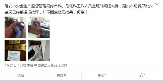 據(jù)新浪微博爆料:延安市安全生產(chǎn)監(jiān)督管理局綜合科、?;乒ぷ魅藛T上班時間睡大覺,延安市紀委只說安監(jiān)局已內(nèi)部通報批評,卻不回復處理結(jié)果,何意?