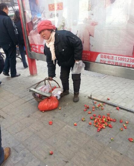 1月25日,榆林府谷中銀賓館對(duì)面,府谷城管車上下來(lái)一男一女,都沒穿制服,女的提起紅頭巾農(nóng)婦的一筐草莓就上了車。農(nóng)婦顧不得撒了一地的草莓,去執(zhí)法車窗前好言討要,誰(shuí)知,城管執(zhí)法車竟然加速開走了!如此執(zhí)法合適嗎?收走草莓不需要執(zhí)法單據(jù)嗎?收回去的草莓怎么處理了呢?