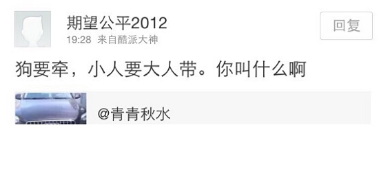 張冰女士,昨晚我的克制和今天中午的提醒,看來沒起作用。那么,您以及駕車的司機和您的走卒,別以為用錢雇傭水軍就可以搞定一切!你,欠我的女兒一個道歉!我作為她的父親,會為她討回公道!
