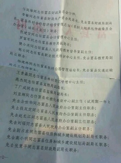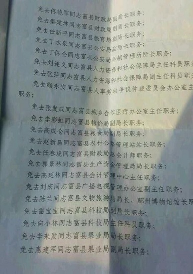 據(jù)富縣人民政府網(wǎng)站資料顯示,富縣縣委機(jī)關(guān)2009年發(fā)布的《中共富縣縣委關(guān)于高東拴等同志職務(wù)任免的通知》中,也共有56名官員職務(wù)出現(xiàn)變動(dòng),其中被免職的有28人。