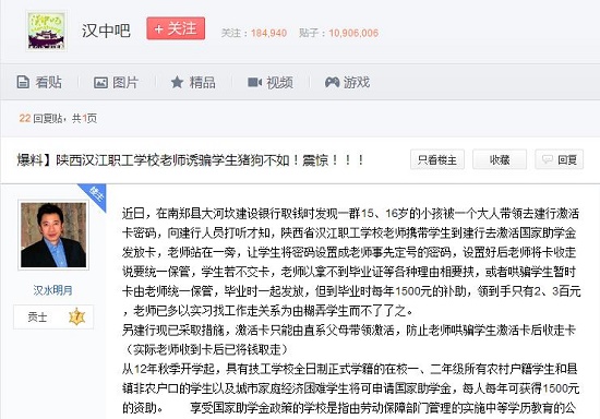 近日,在南鄭縣大河坎建設銀行取錢時發(fā)現(xiàn)一群15、16歲的小孩被一個大人帶領去建行激活卡密碼,向建行人員打聽才知,陜西省漢江職工學校老師攜帶學生到建行去激活國家助學金發(fā)放卡,老師站在一旁,讓學生將密碼設置成老師事先定號的密碼,設置好后老師將卡收走說要統(tǒng)一保管,學生若不交卡,老師以拿不到畢業(yè)證等各種理由相要挾,或者哄騙學生暫時卡由老師統(tǒng)一保管,畢業(yè)時一起發(fā)放,但到畢業(yè)時每年1500元的補助,領到手只有2、3百元,老師已多以實習找工作走關系為由糊弄學生而不了了之。