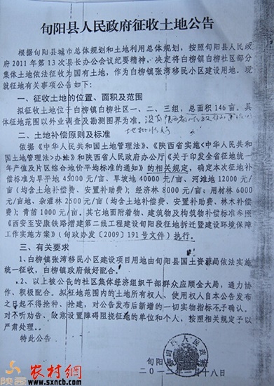 1月8日,陜西農(nóng)村網(wǎng)以《旬陽縣白柳鎮(zhèn)地遭強(qiáng)占6旬老婦被打骨折》為題,報(bào)道了旬陽縣白柳鎮(zhèn)村民的地遭遇強(qiáng)占一事。報(bào)道發(fā)出后就不斷有村民向本報(bào)打來電話,反映此次征地中的諸多問題。