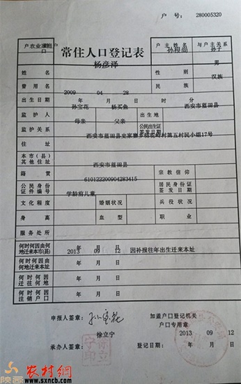 在藍(lán)田縣史家寨鎮(zhèn)駱駝嶺村,記者見(jiàn)到了村委會(huì)委員李永利。他告訴記者:“孫寶花的兒子楊彥澤啥時(shí)候上的戶口,我根本不知道。按照多年上報(bào)戶口流程,首先必須由我們村開(kāi)具遷入登記介紹信,這個(gè)介紹信是由史家寨派出所給各村統(tǒng)一發(fā)放的,然后,村民帶上這個(gè)介紹信找包村干部簽字,再到鎮(zhèn)政府政務(wù)大廳開(kāi)具證明,并帶齊其他證件到派出所辦理。而孫寶花的兒子上戶口沒(méi)有經(jīng)過(guò)這些流程,好似從天而降,一下子攪得我們村不安靜了?!?