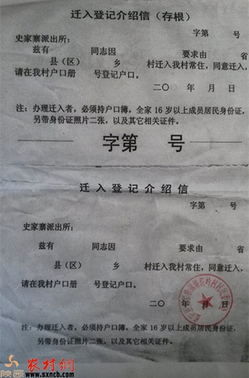 圖為史家寨派出所下發(fā)的遷入登記介紹信