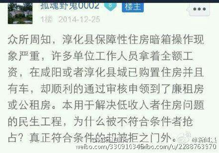 近日,網(wǎng)友“孤魂野鬼0002”發(fā)帖稱,淳化縣保障性住房暗箱操作現(xiàn)象嚴(yán)重,許多單位工作人員拿著全額工資,在咸陽或淳化縣城已購(gòu)置住房并且有車,卻順利通過審核申領(lǐng)到了廉租房或公租房。