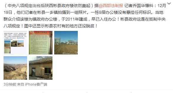 據(jù)新浪微博爆料:【中央八項規(guī)定出臺后陜西彬縣政府樓依然蓋起】據(jù)網(wǎng)友爆料:12月19日,他們記者在彬縣一鄉(xiāng)鎮(zhèn)拍攝到一組照片。一棟9層辦公樓沒有懸掛任何標(biāo)識。當(dāng)?shù)厝罕娊榻B該樓為鎮(zhèn)政府辦公樓,于2011年建成,早已入住辦公!彬縣政府這是在抵制中央八項規(guī)定!圖中還顯示彬縣農(nóng)村有的地方還沒脫貧!