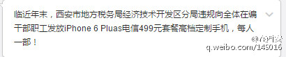 據(jù)新浪微博爆料:騰訊網(wǎng)友“利劍”透露了一件事:“臨近年末,今天(22日)下午,西安市地稅局經(jīng)濟技術(shù)開發(fā)區(qū)分局,向全體在編干部職工每人發(fā)放了一部iPhone 6 Plus,是電信499元套餐高檔定制手機,每人一部哦?!?/p>
