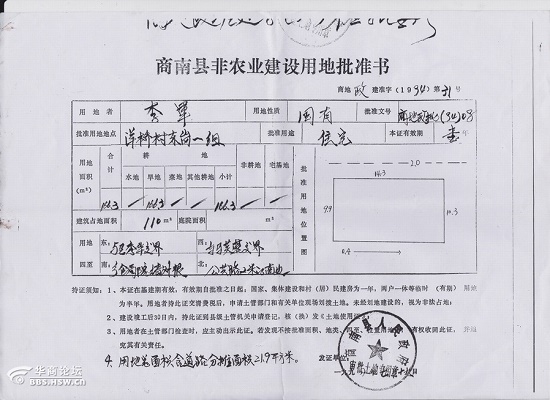 3.商南縣人民政府審批土地件商政地批(2013)03號文件(2013.1.16)批復(fù)王秀華(劉鳳鑫之妻)劃撥用地變更為出讓,批復(fù)用地面積為152.6㎡,并敲明叫響不得超占超建,且不說這塊土地家家戶戶持有建設(shè)用地批準(zhǔn)書。(用地總面積含有道路分?jǐn)偯娣e21.9㎡,各家不等,土地用地批準(zhǔn)書附后)劉風(fēng)鑫經(jīng)商南縣國土局查處,實際建設(shè)面積為188.7㎡,超占面積為35㎡,即占用了自己的公攤面積,又占用國有面積,國土局申請商南法院“強(qiáng)制執(zhí)行”有文有號,商南縣法院2014年4月29號也向劉本人送達(dá)了法律文書,但時到今日,法律失效早已過期,然劉少批多建違法建筑可以說:“任憑國法,法律,統(tǒng)統(tǒng)對我無效,國土也好,法律也罷,我自巍然不動,只要能來錢,頂著風(fēng)也上?!?/p>